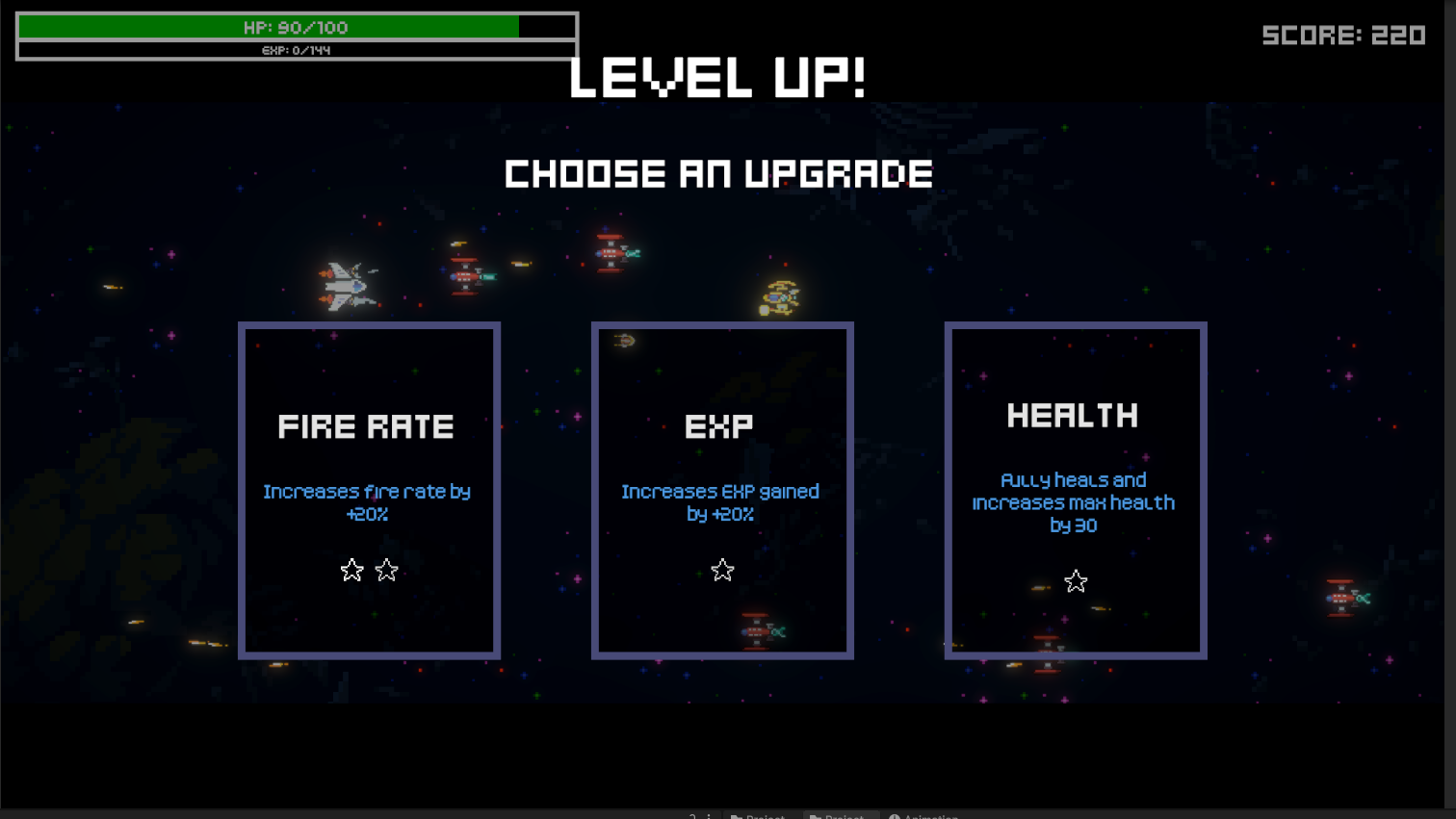 - Programming - Enemy wave spawning, player stats and upgrades, basic player & enemy movement + behaviour